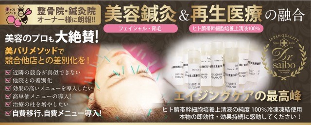 人々の興味を引き付けるメニューとは、どんなメニューなのか。皮膚深部まで溶剤を送り込めるハイドレティングシステムの機器で水光注射用ハンドピースの強力な噴霧作用、溶剤をナノ化まで分解し皮膚に導入。使用する溶剤は「ヒト臍帯幹細胞培養上清液」で、効果がわかりやすく衰えた細胞を若々しい状態に導き肌のエイジングはもちろん再生美容と発毛にまで大きな効果を発揮させる医療機関でも使用される純度の高いものです。スキンケアに始まり、脳梗塞の後遺症や創傷治癒を早めるなど、時代にあった求められるメニューになります。このメニューの監修グループには、抗老化成分として注目されるNMNやPDS技術の研究を行っている一般社団法人次世代吸収研究会とドクターズコスメを開発・販売するドクターアクアが存在。2社による監修グループに、ヒト臍帯幹細胞培養上清液のメソッド「美バリメソッド」が加わり驚異のトライアングルに。このトライアングルに美容鍼灸が加わることで最強のメソッドが完成へ。予約制、今、求められる少人数制、単価アップしてこそ可能な空間の確保ができます。魅力的なメソッドは、あらゆる実現を可能に。